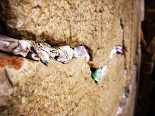The Western Wall is one of my favorite places in Jerusalem. The wall is the most holy spot for Jews. It is custom to fold prayers or requests and put them in the cracks. The papers are taken out every so often and stored, in Jewish tradition it is not right to burn or destroy anything with the name of God on it, so they have places all over the country where they store these papers. The wall is sacred because it is the closest thing they Jews have to the temple. So these are a couple of pictures of the prayers, it's a special place.
